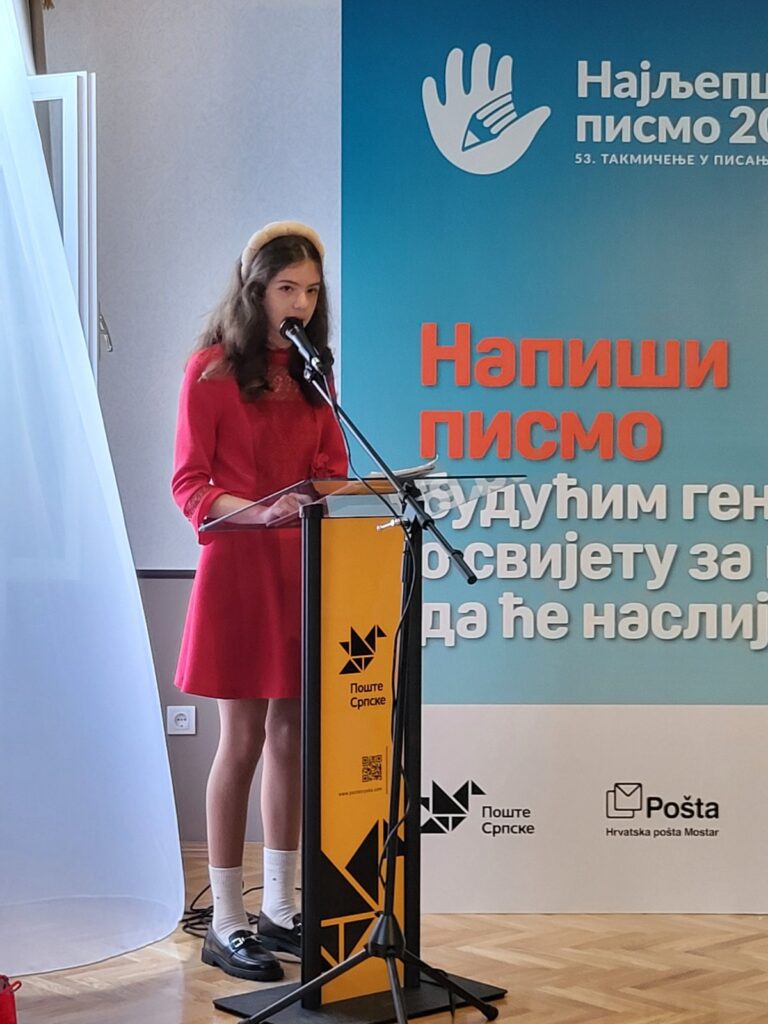 Na svečanosti održanoj u Kulturnom centru „Kuća Milanovića“ u Banjoj Luci uručene su nagrade najuspješnijim učenicima natjecanja „Najljepše pismo mladih BiH 2024.“, koje su zajednički organizirale Hrvatska pošta Mostar, BH Pošta i Pošte Srpske.