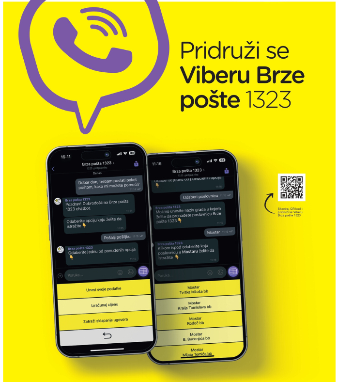 Brza pošta 1323 sada pruža još bolje iskustvo svojim korisnicima putem Viber platforme! Od sada, naša usluga je dostupna i na Viber poslovnom kanalu i Viber bot-u omogućujući još bržu razmjenu informacija o dostavi pošiljaka uz brojne dodatne pogodnosti.