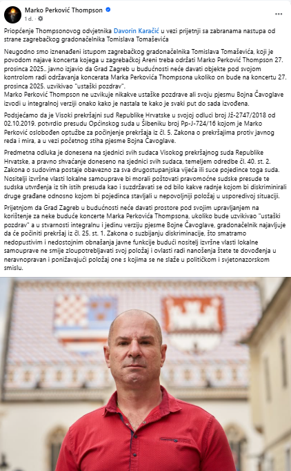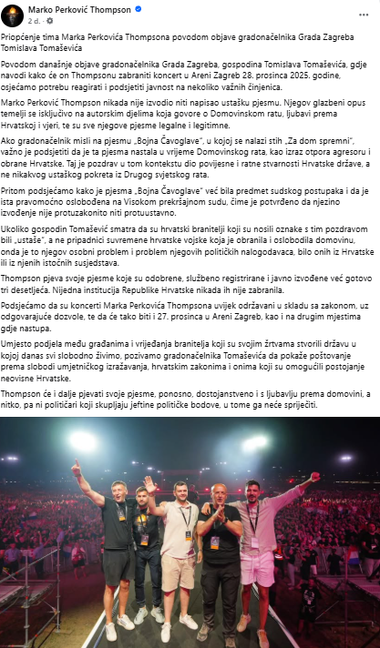 Neugodno smo iznenađeni istupom zagrebačkog gradonačelnika Tomislava Tomaševića, koji je povodom najave koncerta kojega u zagrebačkoj Areni treba održati Marko Perković Thompson 27. prosinca 2025.. javno izjavio da Grad Zagreb u budućnosti neće davati objekte pod svojom kontrolom radi održavanja koncerata Marka Perkovića Thompsona ukoliko on bude na koncertu 27. prosinca 2025. uzvikivao “ustaški pozdrav”.