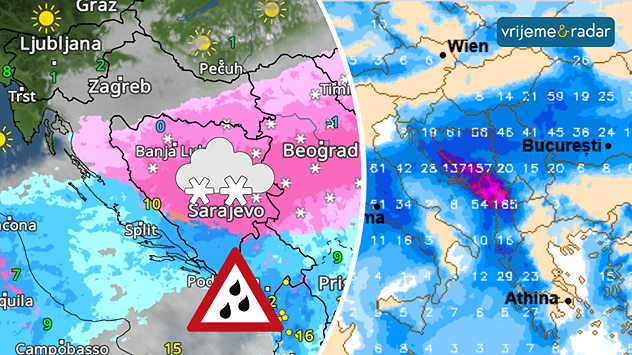 VremenskiRadar pokazuje za nedjelju snijeg u dijelovima Hrvatske i većem dijelu BiH, osim na jugu. U Dalmaciji i na jugu regije kiša i pljuskovi sa grmljavinom uz obilnije oborine/padavine (prikazuje prognoza vremenskih modela, desna slika).