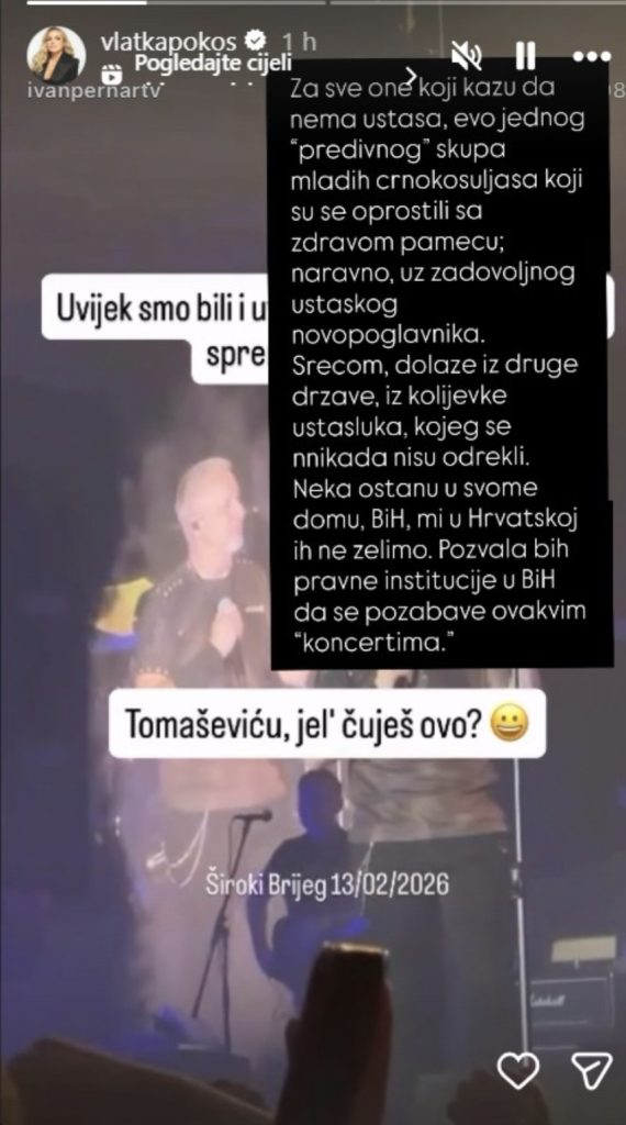 “Za sve one koji kažu da nema ustaša, evo jednog ‘predivnog’ skupa mladih crnokošuljaša koji su se oprostili sa zdravom pameću; naravno uz zadovoljnog ustaškog novopoglavnika. Srećom, dolaze iz druge države, iz kolijevke ustašluka, kojeg se nikada nisu odrekli. Neka ostanu u svome domu, u BiH, mi u Hrvatskoj ih ne želimo. Pozvala bih pravne institucije u BiH da se pozabave ovakvim koncertima”, napisala je.