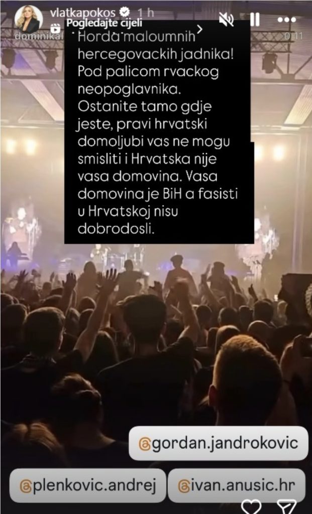 Onda je dodala još jedan story gdje je bila još manje suptilna: “Horda maloumnih hercegovačkih jadnika! Pod palicom rvackog neopoglavnika. Ostanite tamo gdje jeste, pravi hrvatski domoljubi vas ne mogu smisliti i Hrvatska nije vaša domovina. Vaša domovina je BiH, a fašisti u Hrvatskoj nisu dobro došli”, napisala je Pokos. U drugoj objavi je označila Andreja Plenkovića, Gordana Jandrokovića i Ivana Anušića.
