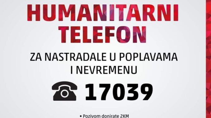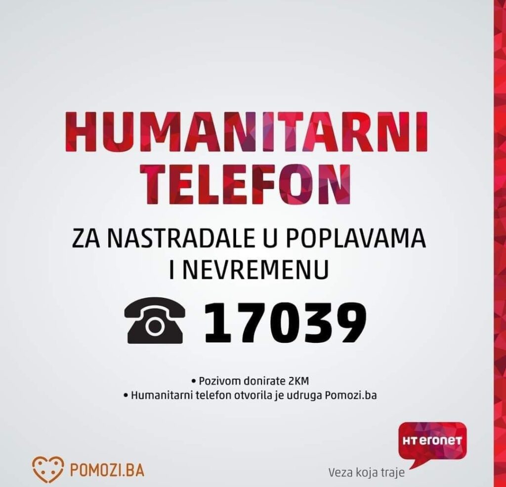 Za nastradale u poplavama i nevremenu koje je noćas pogodilo našu zemlju, otvoren je humanitarni telefonski broj udruge Pomozi.ba – 17039. Pozivom donirate 2 KM.